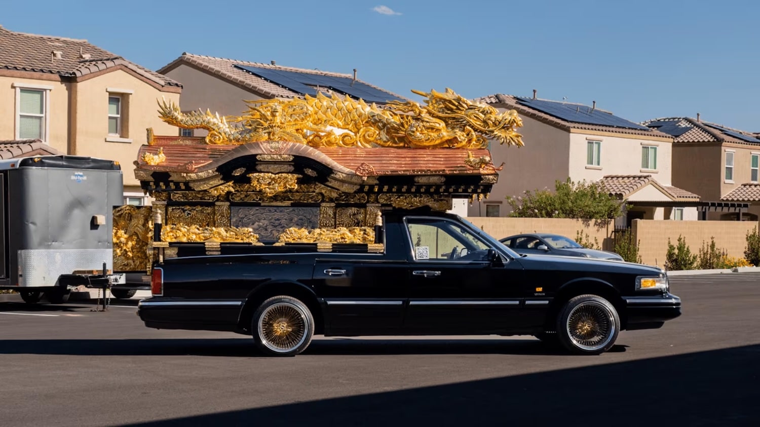 The left-hand drive hearse conversion is fitted with quite a lot of ornate, hand‑crafted particulars that stay inline with conventional Japanese funeral customs. The large, golden dragon driving atop the automobile is the obvious, in fact, and it’s a part of a extremely detailed piece that’s actually show-worthy. Open up that addition, and it’s extra of the identical, as the within can also be superbly crafted and extremely detailed, although the entrance cabin stays unchanged.